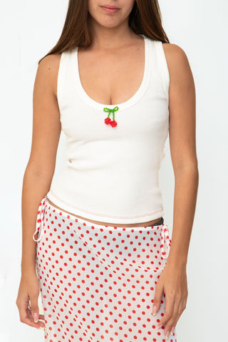 Simple black & white tank tops with a cherry on top! Comes in two sizes. Made from recycled cotton.