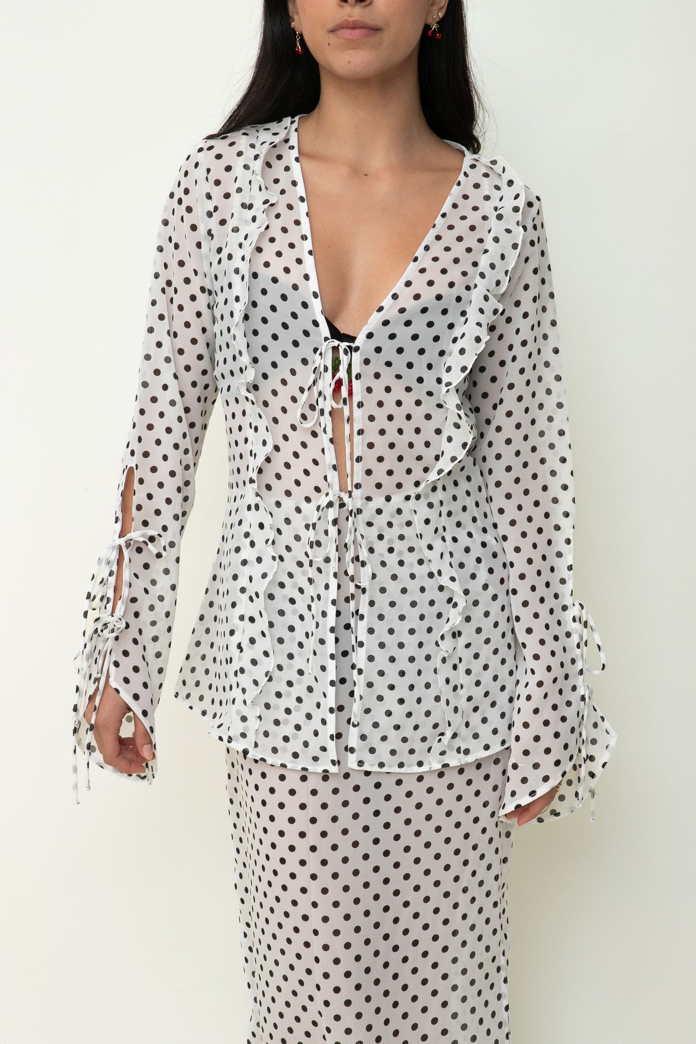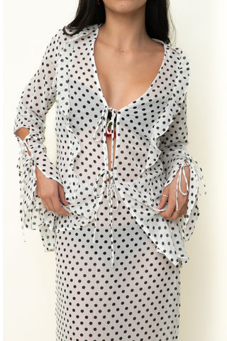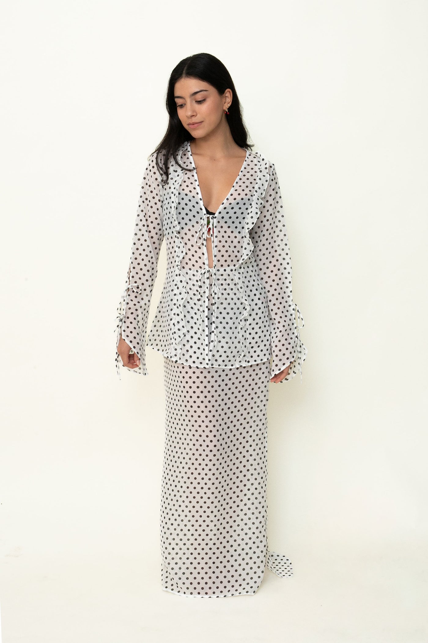 Polka Dot Set blanco con negro. Top de manga larga y falda larga ajustable. Disponible en dos tallas. Hecho de material ligero con caída.