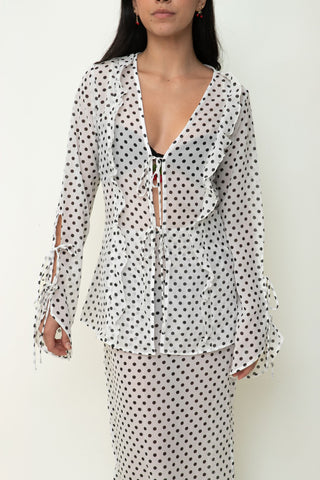 White & Black Polka Dot Set. Sheer Long-sleeve top and adjustable long skirt. Comes in two sizes. Made from lightweight fabric.